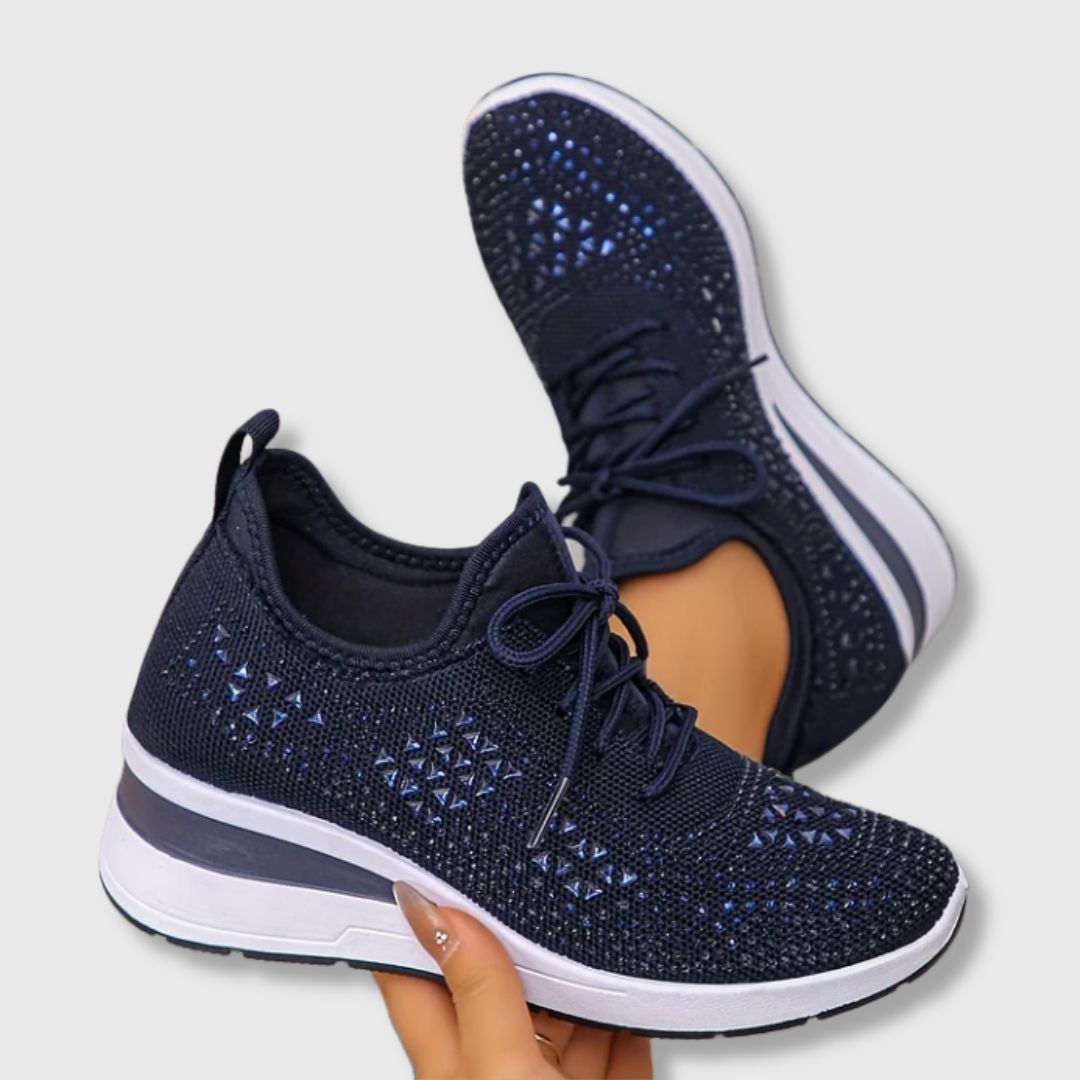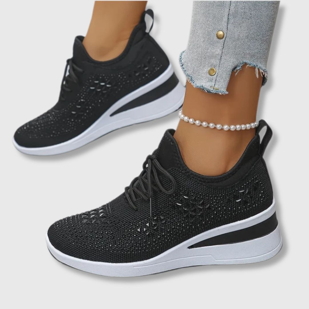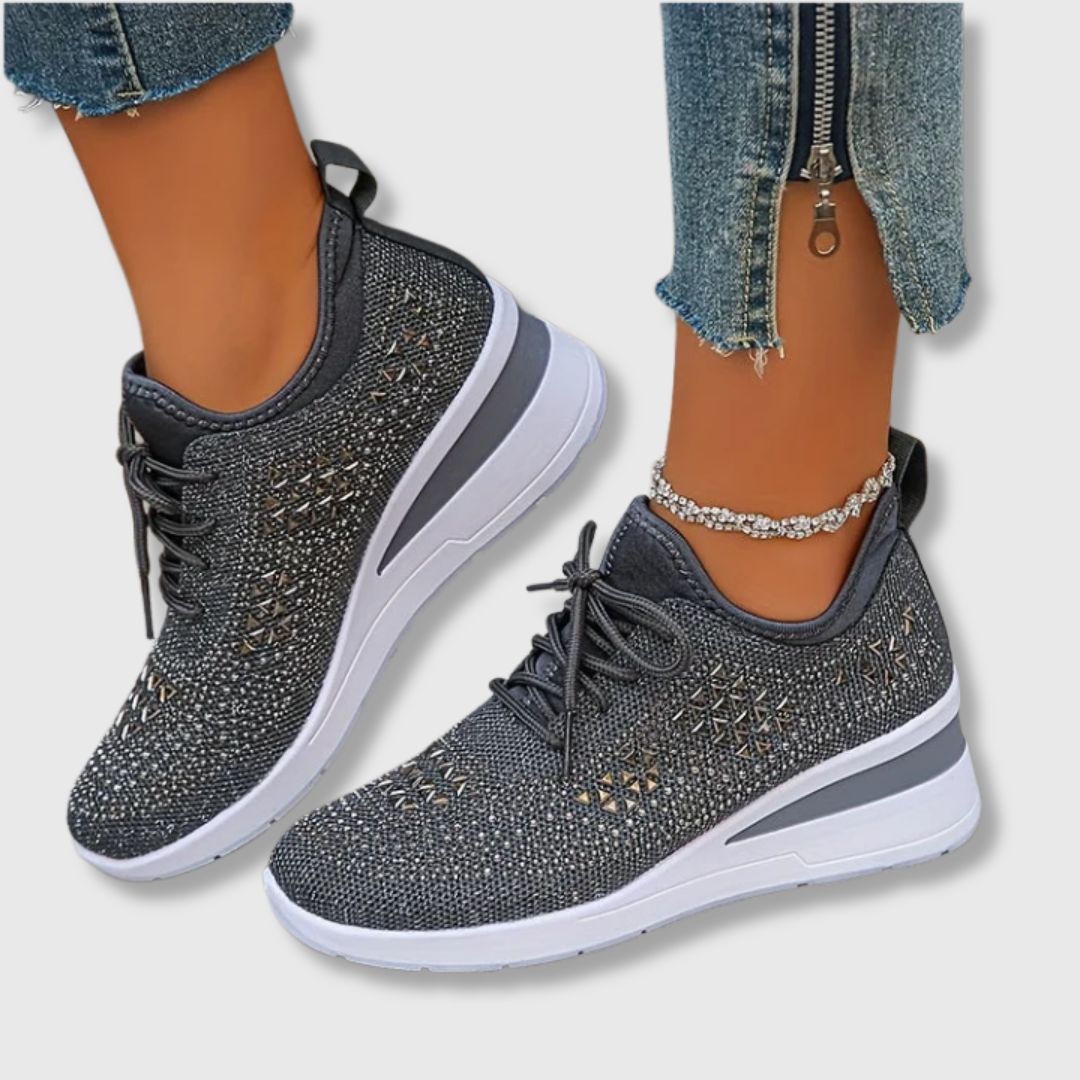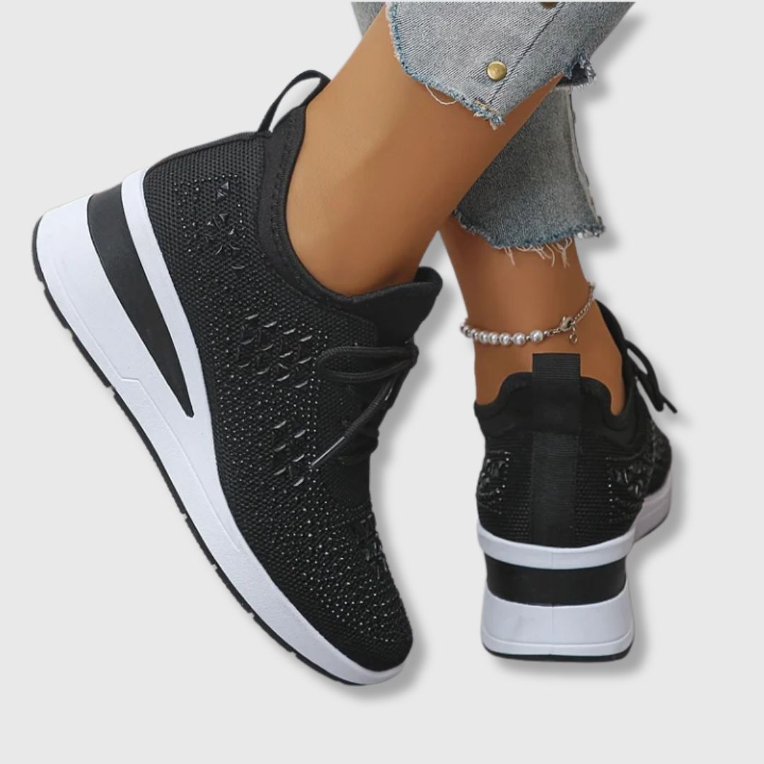 - Dizájn: légáteresztő szövött felsőrész, finoman megemelt sarok, párnázott talp boltozati támaszszal, visszafogott csillogó részlet